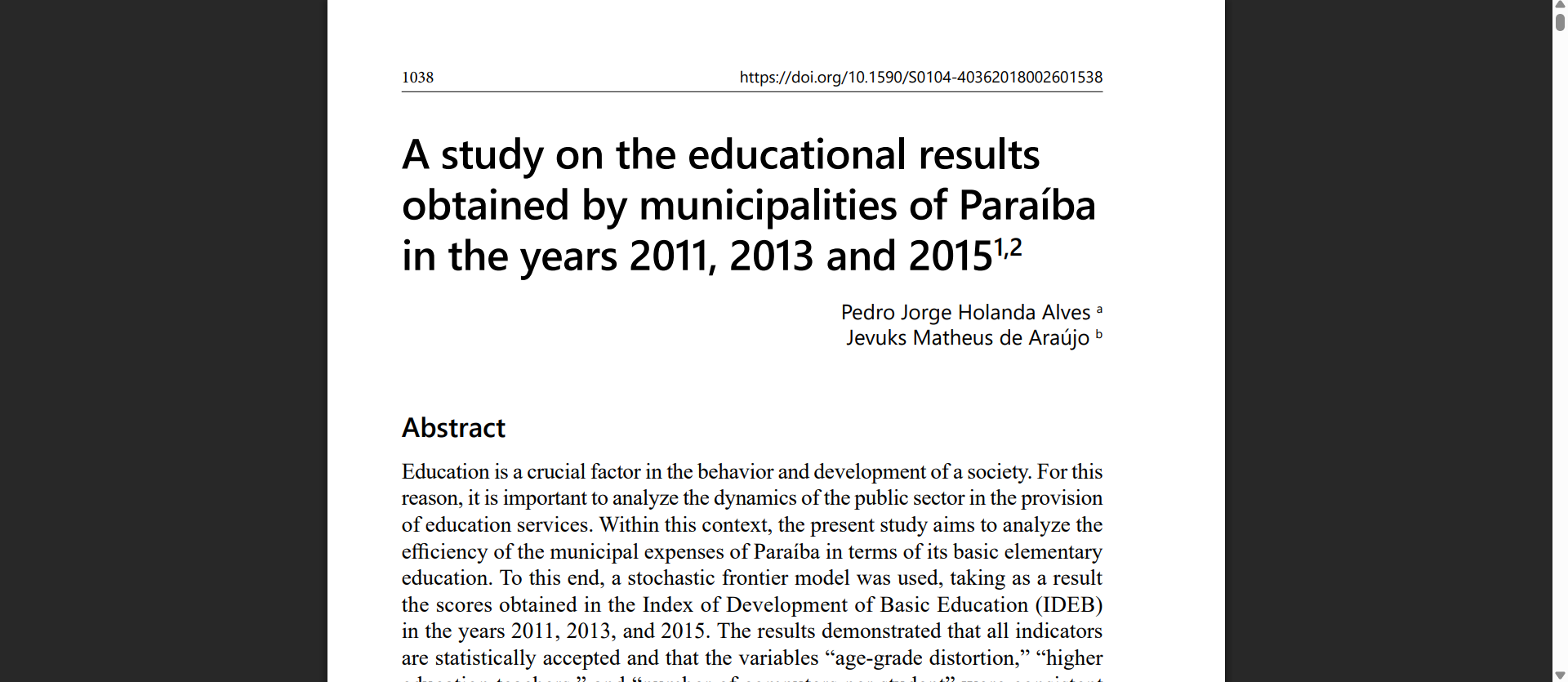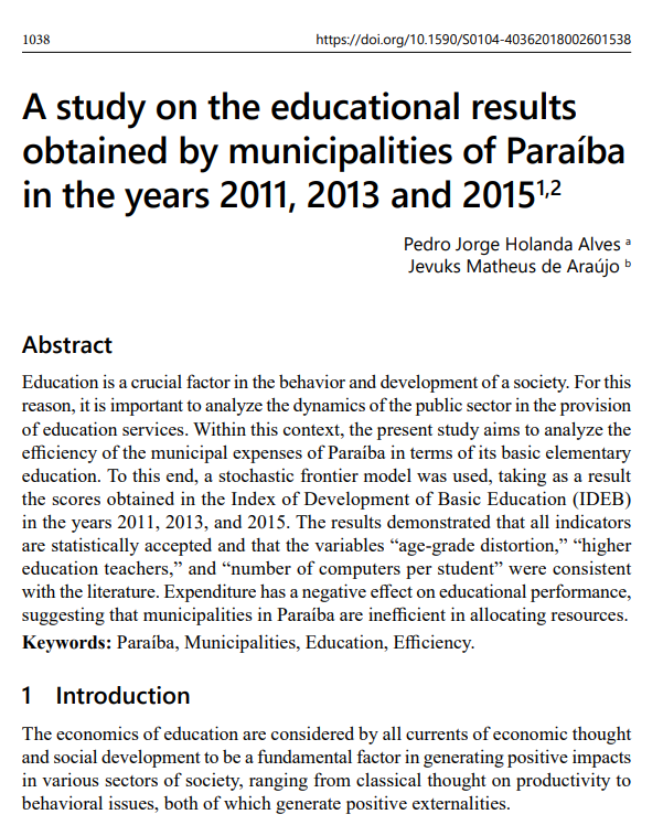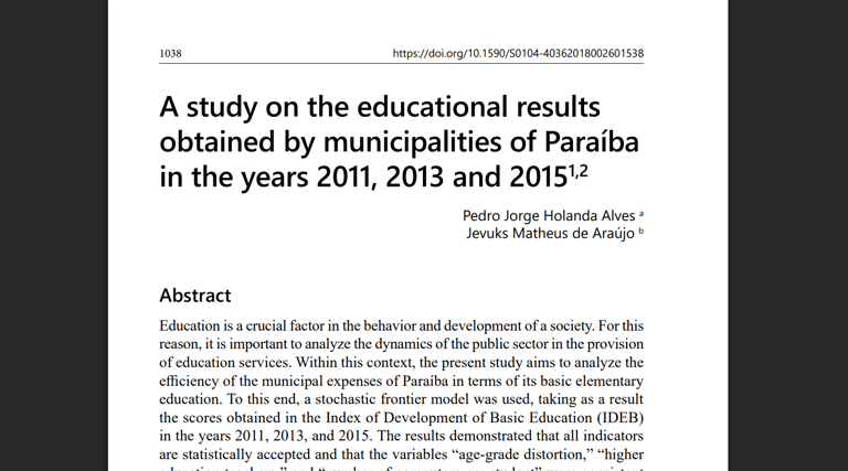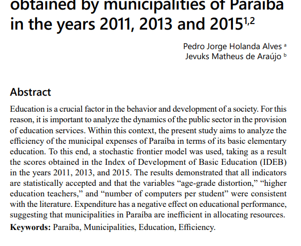 Abstract: This paper analyzes the efficiency of municipal public spending on basic education in Paraíba in the years 2011, 2013, and 2015, using a stochastic frontier model with IDEB as the dependent variable. The results show a negative correlation between public spending and educational performance, indicating inefficient use of resources. Moreover, age–grade distortion is found to reduce IDEB, while an increase in the number of teachers with higher education and in the availability of computers per student improves performance.