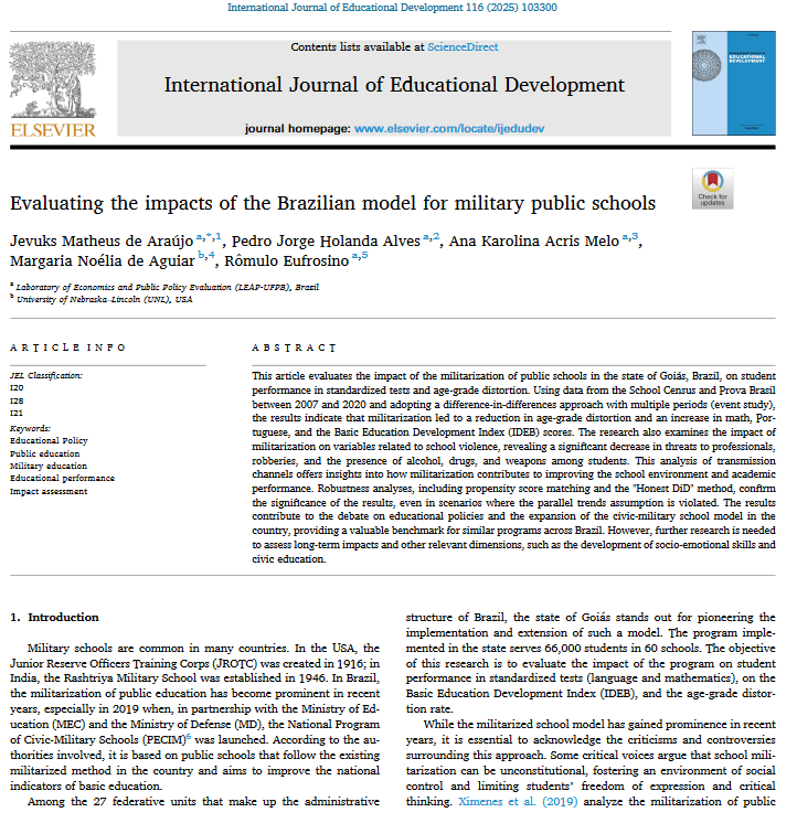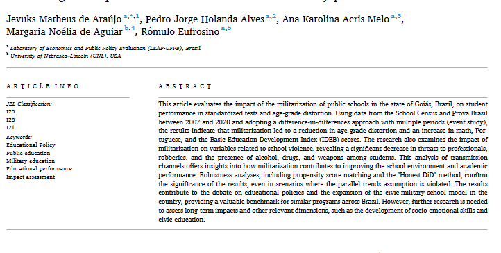 Abstract: This paper evaluates the impact of the militarization of public schools in Goiás between 2007 and 2020. The findings show a reduction in age–grade distortion, improvements in performance in Mathematics, Portuguese, and IDEB scores, as well as a decline in school violence incidents. The evidence suggests that the school environment became safer and more conducive to learning.