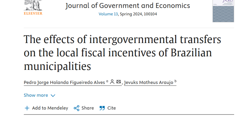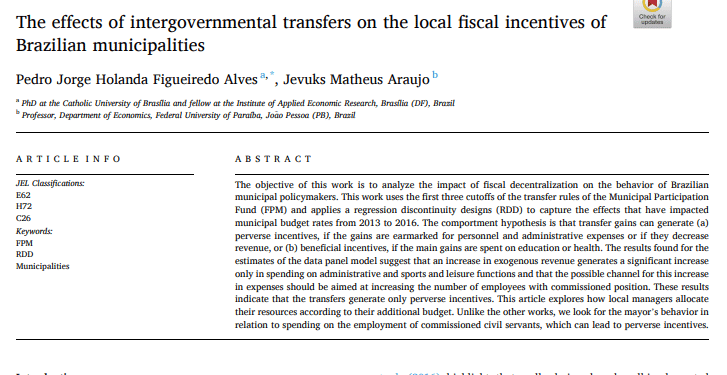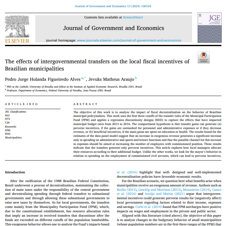 Abstract: This paper evaluates the impact of fiscal decentralization through the Municipal Participation Fund (FPM) on the behavior of local governments between 2013 and 2016. Using a regression discontinuity design, the study finds that increases in exogenous revenue are primarily allocated to administrative expenses and appointed positions, revealing perverse fiscal incentives.