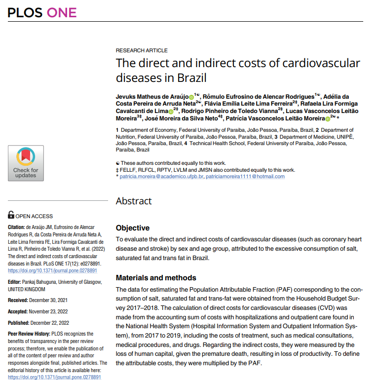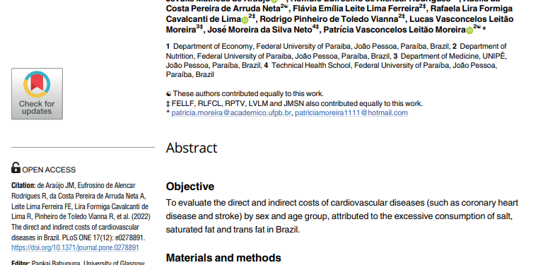 Abstract: The study estimated the economic costs of cardiovascular diseases attributable to excessive consumption of salt, saturated fat, and trans fat in Brazil. Between 2017 and 2019, total costs reached US$ 7.18 billion, with a loss of 1.53 million productive years due to premature deaths. The greatest impact was observed among men aged 45 to 74, particularly in direct costs. Salt was the nutrient with the highest impact, followed by saturated and trans fats.