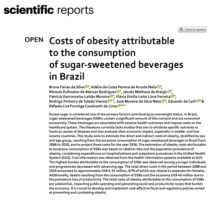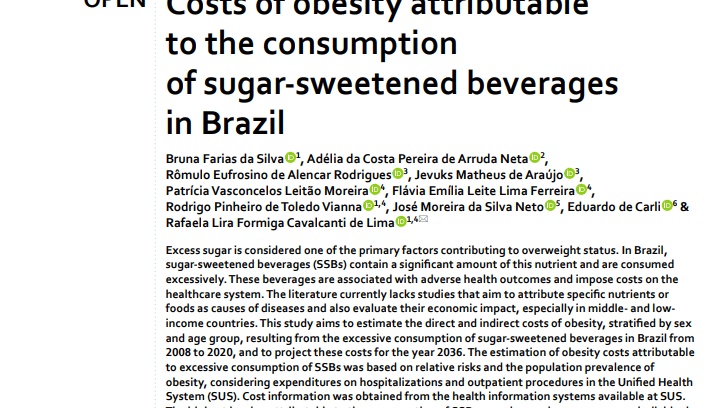 Abstract: The study estimates that, between 2008 and 2020, excessive consumption of sugar-sweetened beverages generated direct costs of US$ 6.33 million for Brazil’s Unified Health System (SUS) and productivity losses of US$ 40 million, affecting mainly women and young people. Obesity attributable to these beverages places a substantial burden on both the healthcare system and the Brazilian economy. Effective public policies are urgently needed to mitigate the health and economic impacts of this issue.