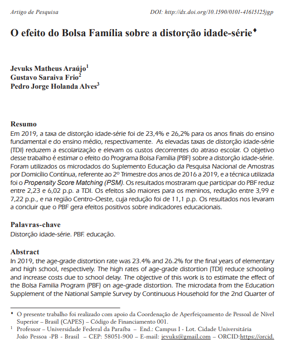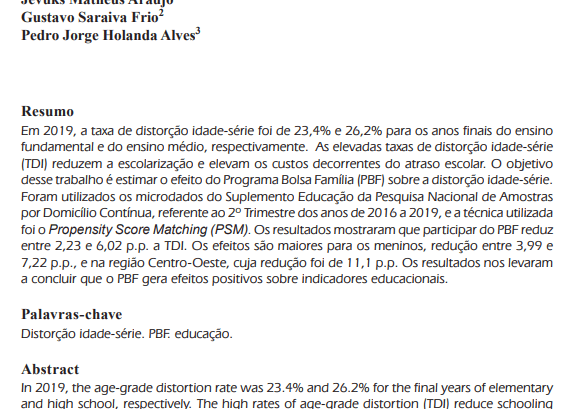 Abstract: This paper estimates the impact of the Bolsa Família Program (PBF) on age–grade distortion in Brazil, using microdata from the Continuous PNAD (2nd quarter of 2016 to 2019) and the Propensity Score Matching (PSM) methodology. The results show that participation in PBF reduces age–grade distortion by 2.23 to 6.02 percentage points, with stronger effects among boys (up to 7.22 p.p.) and in the Center-West region (up to 11.1 p.p.). The study reinforces the evidence that the program contributes positively to educational outcomes.