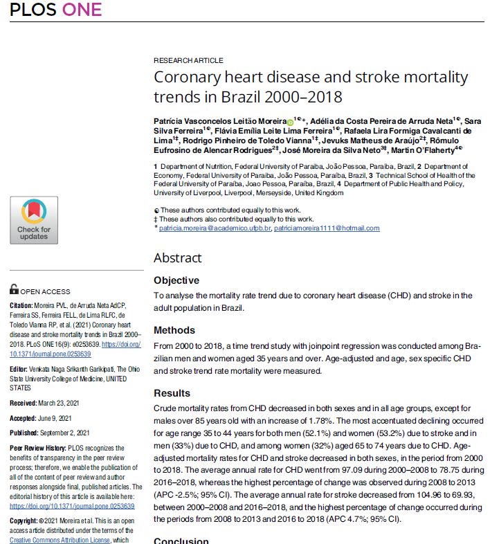 Abstract: Between 2000 and 2018, mortality rates from coronary heart disease and stroke declined among Brazilian adults, except for men over 85 years old. The most pronounced reductions were observed among individuals aged 35 to 44. Age-adjusted rates also decreased significantly throughout the period. This progress reflects improvements in healthcare and lifestyle, but requires sustained efforts to continue.